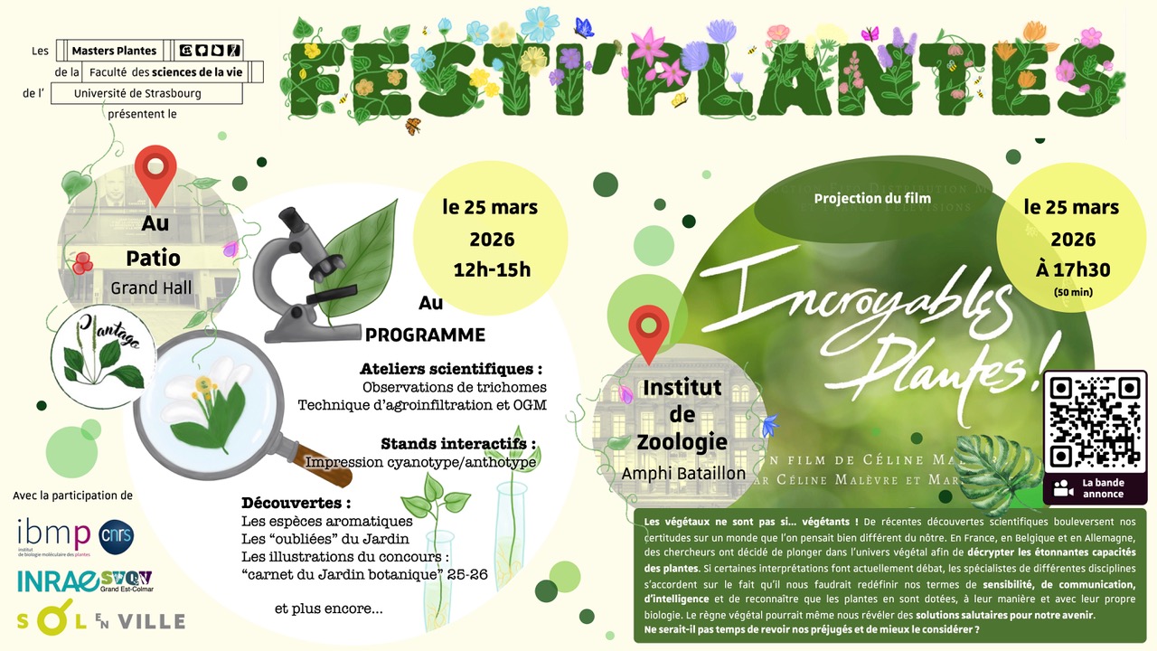 Le Festi'Plantes 2026 est organisé par les étudiants de M1, les membres de l'association Plantago et l'équipe pédagogique des 3 parcours de master "Plantes ..." de la faculté des sciences de la vie de l'Unistra.